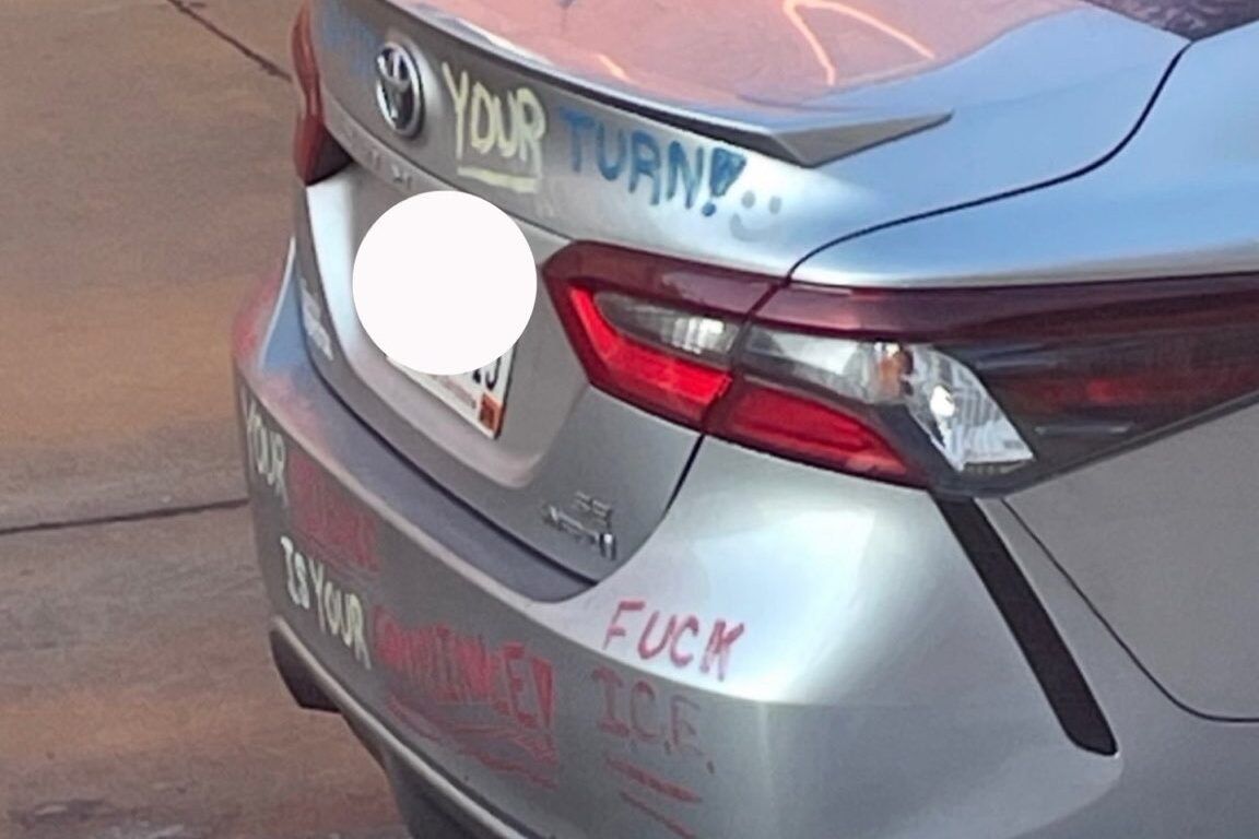 In a post on X, Van Orden alleged the individual was “shouting slurs, pounding on our doors, and attempting to force his way inside.” He also shared photos of a vandalized vehicle spray-painted with messages including “Your Turn!” and “F— ICE.”